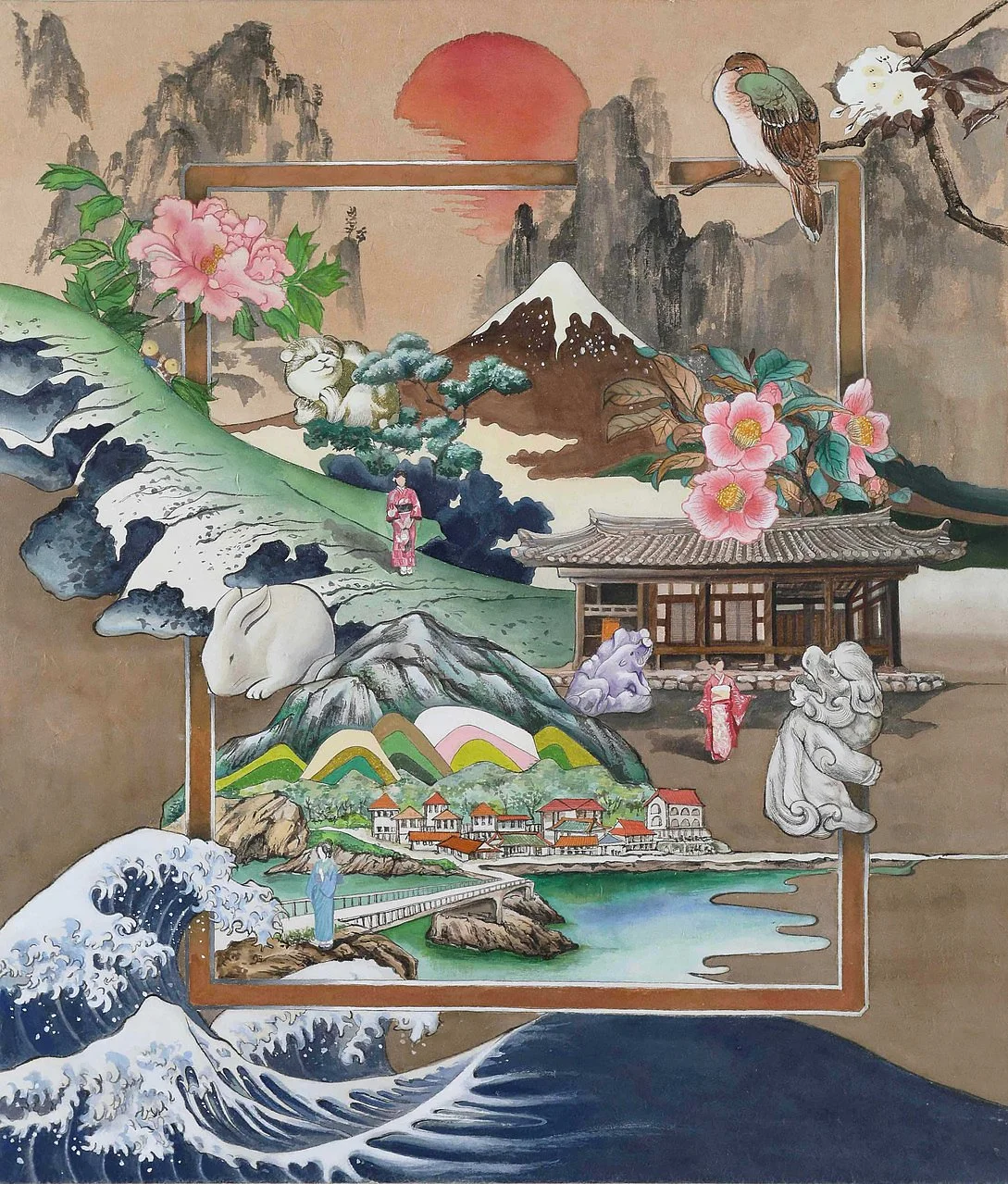 Early images from my upbringing, such as Hokusai’s Great Wave, Mt. Fuji, my family’s minka house, and the folds of a kimono, continue to shape how I see and create. Three Netsuke, small ivory carvings from the Tokugawa period (1603 - 1868) collected by my grandfather, Shishi, Akita, and Usagi, serve as omens for luck, fortune, and prosperity. Moving from Shizuoka to Seoul at eight brought distance and dislocation. This work pieces together what felt lost, preserving his stories, patience, precision, and curiosity.